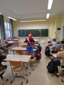 Renate Sommer: Gästeführerin Renate Sommer bringt die Schüler der Klasse 3a auf gute Ideen mit Geschichten vom Zu spät kommen