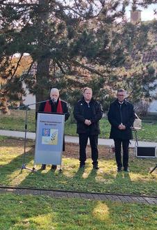 Im Anschluss erfolgte die Kranzniederlegung. Herr Frey, Herr Dähnert und Herr Richter legten gemeinsam einen Kranz nieder, ebenso Herr Koch, Herr Küntzel und Herr Schütz. Die feierliche Zeremonie wurde erneut musikalisch begleitet.