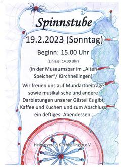 Unsere Traditionsveranstaltung findet am Sonntag, dem 19.2.2023 im „Alten Speicher“ (Museumsbar) statt. Ab 14.30 Uhr ist Einlass und 15.00 Uhr wird die Spinnstube eröffnet. Wie gewohnt wird Kaffee und ein reichhaltiges Kuchenbuffet angeboten.