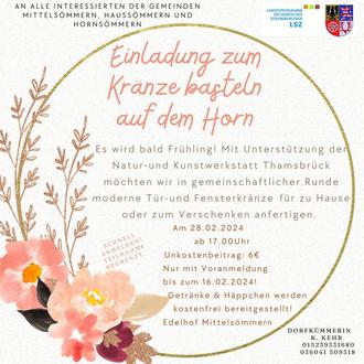 Der Frühling steht bald vor der Tür! Lasst uns in gemeinschaftlicher Runde mit Unterstützung der Natur-und Kunstwerkstatt Thamsbrück moderne, individuelle Tür- und Fensterkränze herstellen zum Verschönern im eigenen zu Hause oder zum Verschenken.