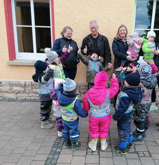 Die Erwachsenen im Hintergrund sind von links nach rechts: Elternbeiratsmama Katja, Opa Peter (Sponsor), Elternbeiratsmama Christin.