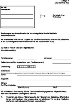 Die Vorschlagsliste soll alle Gruppen der Bevölkerung nach Geschlecht, Alter, Beruf und sozialer Stellung angemessen berücksichtigen. Der eingereichte Vorschlag muss Geburtsname, Familienname, Vorname, Geburtsdatum und -ort, Wohnanschrift und Beruf enthalten. Vorschläge sind bitte schriftlich bis zum 28. April 2023 an die Verwaltungsgemeinschaft Bad Tennstedt, Hauptamt, Herr Fischer, Markt 1, 99955 Bad Tennstedt zu senden.