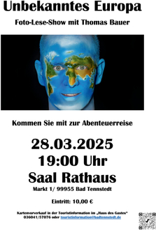 Der Münchner Abenteurer Thomas Bauer hat schon viel erlebt. Unter anderem ist er mit einem italienischen Koch den Franziskusweg von Florenz über Assisi nach Rom gewandert und hat Frankreich auf einem Postrad umrundet. Er hat Bergabenteuer im Balkan erlebt und in Grönland erfahren, wie sich minus 42 Grad anfühlen und wie Eisbärfleisch schmeckt. Am Freitag, 28. März 2025, stellt er um 19:00 Uhr im Rathaus-Saal Bad Tennstedt die Höhepunkte seiner Abenteuertouren vor - und zeigt, dass man auch in Europa sehr viel erleben kann. Thomas Bauer liest Ausschnitte aus seinen Reisebüchern, beantwortet Fragen rund ums Reisen, zeigt spektakuläre Bilder und bringt außerdem die Perkussionistin bTina Raithel mit, die gemeinsam mit ihm live zu den Reisebildern spielen wird. Lassen Sie sich diese ganz besondere Europareise nicht entgehen!