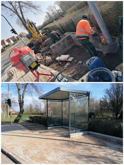 Und nun ist es soweit! Der Platz um die Haltestelle wurde verbreitert und neu gepflastert und nun steht hier eine wunderschöne Überdachung für alle Wartenden. Regen und Wind stören nun nicht mehr, selbst wenn es mal eine Verspätung geben sollte. Dieses Bushäuschen ist eindeutig eine großartige und nachhaltige Aktion für alle Anwohner und ein gutes Beispiel dafür, was Kinder in Zusammenarbeit mit Erwachsenen gemeinsam schaffen können.