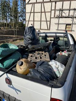 Die Aktion dauerte insgesamt zwar nur zwei Stunden, doch wurde auch in so kurzer Zeit eine solche Menge an achtlos weggeworfenem oder gar illegal entsorgtem Müll zusammengetragen, dass die Ladefläche eines Pickups mehr als voll war. Mit Folien, Kanistern mit Altöl, einem alten Fernsehgehäuse, Autoreifen, einer kaputten Regentonne übertrafen die Funde unsere Erwartungen im negativen Sinn. Für die ordnungsgemäße Entsorgung danken wir der Gemeindeverwaltung.