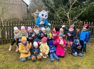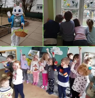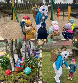 Vor den Osterferien entdeckten die Kinder vom Fenster aus jemanden, der durch den Garten hoppelte und heimlich Überraschungen versteckte. Plötzlich winkte er den Kindern auch noch zu. Es war der Osterhase. Schnell zogen sich die Kinder an, liefen hinaus ins Grüne und suchten die versteckten Geschenke. Jedes Kind fand auch etwas. Der Osterhase unterhielt sich sogar noch eine Weile mit den Kindern, bis er dann mit seinem großen Korb auf dem Rücken weiterziehen musste. Wir sagen Danke an den Osterhasen!
