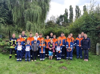 Das Bild zeigt unsere Jugendfeuerwehr zusammen mit ihren Betreuern und dem Bürgermeister nach erfolgreicher Teilnahme an der Sternwanderung.