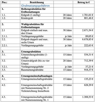 | (3) | Die Gebührenschuld entsteht mit der Bestattung, mit der Benutzung der jeweiligen Teileinrichtung des Friedhofs, mit der Inanspruchnahme sonstiger Leistungen der Friedhofsverwaltung, mit dem Erwerb eines Nutzungsrechtes gemäß der Friedhofssatzung. | |