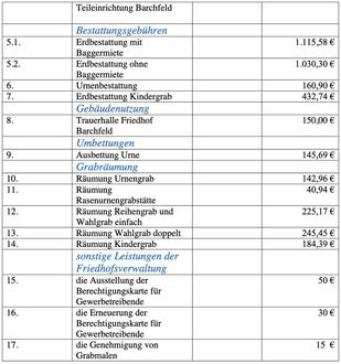 | (2) | Für die Beschriftung der Stelen werden Auslagen in Höhe der tatsächlich entstandenen Kosten erhoben. |