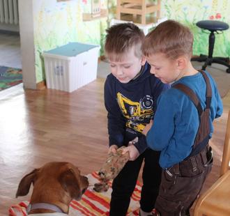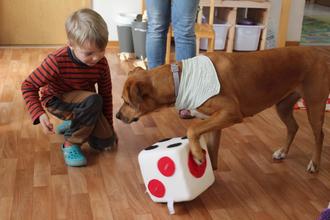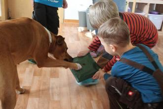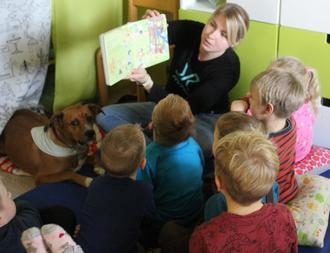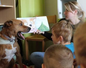 Im zweiten Teil ging es nun um das Buch und darum, wie man sich Hunden gegenüber verhält und wie man die Gesten eines Hundes richtig versteht und deutet. Zum ersten Kennenlernen waren Paula und Betty schon eine Woche vorher einmal zu Besuch im Kindergarten, da war das richtige Verhalten auch bereits Thema und konnte nun durch das Buch und das Spiel wiederholt und gefestigt werden.