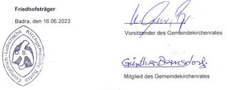 Die vom Gemeindekirchenrat der Kirchengemeinde Badra am 16.06.2023 beschlossene Friedhofsgebührensatzung für den Friedhof in Badra wurde dem Kreiskirchenamt Eisenach als zuständiger Aufsichtsbehörde angezeigt. Die Aufsichtsbehörde hat am 25.7.2023 unter dem Aktenzeichen ... vorstehend genannter Ordnung die kirchenaufsichtliche Genehmigung erteilt.
