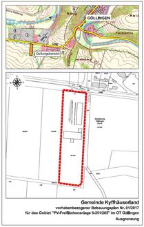Der Gemeinderat der Gemeinde Kyffhäuserland hat mit Beschluss vom 11.03.2021 den Planentwurf des vorhabenbezogenen Bebauungsplans Nr. 01/2017 „PV-Freiflächenanlage Am Schacht 5-351/285“ der Gemeinde Kyffhäuserland beschlossen.