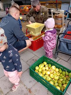Ein Höhepunkt war das Apfelsaftpressen mit Herrn Köhler von der Naturparkverwaltung. Schon einige Tage vorher wurden Äpfel auf der Streuobstwiese gesammelt. Mit großen, staunenden Augen standen die Kinder bereit, als auf dem Hof die Saftpresse aufgebaut wurde. Wie aus einem Apfel ein Getränk wird, das man gleich trinken darf, war für viele ein kleines Wunder und ein sehr leckeres Wunder noch dazu.