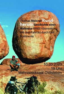 Der Abenteurer Thomas Meixner aus Sachsen- Anhalt berichtet in einer interessanten Dia-Show über seine Weltreise, die ihn mit seinem Fahrrad durch 35 Länder auf fünf Kontinenten führte. Er kurbelte exakt 98951 km rund um den Globus. Am 10. März 2023 um 19 Uhr im Mehrzwecksaal in der Ortschaft Oldisleben (Stadt An der Schmücke) können sie den Weltenbummler persönlich kennen lernen.