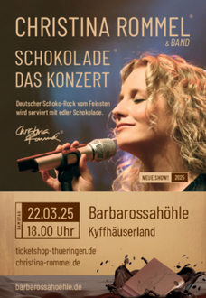Christina Rommel ist eine der derzeit erfolgreichsten Live-Musikerinnen der deutschen Rock-Szene und berühmt für ihre legendären Schokoladenkonzerte. Mit ihrem international einzigartigen Show-Konzept gastiert die Sängerin - mit Chocolatier und Band - am 22.03.25 in Rottleben und überzieht die Barbarossahöhle mit einem Hauch aus Schokolade. Die Bühne wird zur großen Schokoladenküche, in der die Musiker und der Chocolatier gemeinsam ihre Handwerkskunst auf höchstem Niveau zelebrieren. Zu den Klängen bekannter Rommel-Songs beginnt eine fesselnde musikalische Reise durch die Welt der Schokolade; garniert mit genussvollen Schoko-Geschichten und witzigen Dialogen. Verführerische Aromen strömen sanft durch die Luft und harmonieren mit der atmosphärischen Schoko-Kulisse. Chocolatier und Schoko-Mädchen/Jungen servieren diverse Kostproben ihres Könnens und natürlich zeigen Christina Rommel und Band, warum sie zu den besten Live Musikern des Landes gehören.