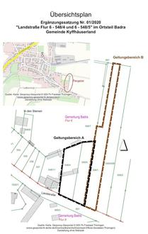 Im Ergebnis des gesetzlich durchgeführten Planverfahrens zur Aufstellung der Ergänzungssatzung Nr. 01/2020 "Landstraße Flur 6 - 548/4 und 6 - 548/5" im Ortsteil Badra der Gemeinde Kyffhäuserland gemäß § 34 (4) Nr. 3 BauGB hat der Gemeinderat der Gemeinde Kyffhäuserland in seiner Sitzung am 15.12.2022 den Abwägungs- und Satzungsbeschluss gefasst.