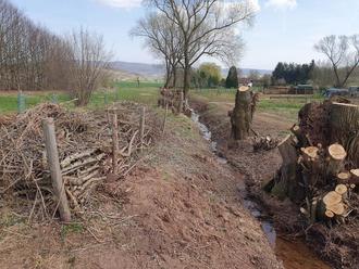 Während Pascal alle Schneidarbeiten mit der Kettensäge ausführte, kümmerten sich die anderen um die Aufarbeitung der Baumkronen. Ohne die Technik der Mithelfenden wäre die Mammutaufgabe nicht zu bewältigen gewesen. Dann ging es noch an das Freilegen des Bachlaufs, der verschlammt war. In Handarbeit wurden Heckenrosen, Weidenausschläge, und anderer Uferbewuchs gekürzt und Schlamm ausgegraben. Mit freundlicher technischer Unterstützung der Firma Marc Bohnert und deren Kleinbagger befreite Reinhard Rumpf das alte Bachbett von weiterem Schlamm, so dass nun im Abschnitt der Gärten ein nahezu ungehinderter Wasserfluss möglich ist.