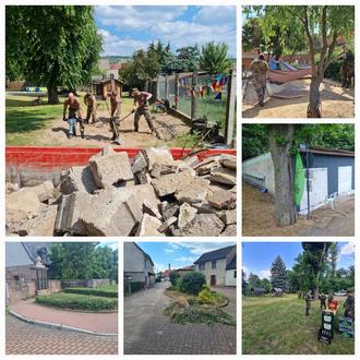 Gute Arbeit und viel geschafft, mit Blick in einen großen Container am Kindergarten. Den haben Soldaten des 1. Versorgungsbataillons 131 aus Bad Frankenhausen bis zum Mittag fast vollständig mit Bruchstücken der Betoneinfassung eines Sandkastens befüllt. Der Container befindet sich auf dem Gelände des Kindergartens „Barbarossastrolche“ und soll in naher Zukunft in die Kur genommen werden. „Das ist eine riesengroße Hilfe“, bestätigt nicht nur der Ortsteilbürgermeister. Der Einsatz der Bundeswehr trage zur Entlastung des Bauhofes bei.