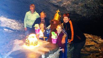 Dann war es endlich soweit! 13.30 Uhr wanderten Lena und Mara mit ihren Eltern und Antje zur Barbarossahöhle. Heike und Kathrin kamen später dazu und wir gönnten uns gemeinsam erst einmal Kaffee und Kuchen. Lena und Mara schleckten mit viel Genuss ihr Eis. Danach empfing uns Frau Anke Schreyer zu einer Extraführung in die Höhle. Sehr interessant gestaltete sie die Führung und voller Neugier hörten wir ihr zu und kamen am Stuhl von Kaiser Barbarossa an.