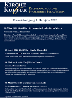 Das zweite verbindende Element in unseren Gemeinden ist das kirchliche Programm „Kirche & Kultur", das in all unseren Orten Kirche, Religion und kulturelles Leben miteinander verbinden möchte. Musik, Ausstellungen, Lesungen, Feste und Begegnungen schaffen Räume, in denen Menschen zusammenkommen können - unabhängig davon, wie vertraut sie mit Kirche sind. So kann Gemeinschaft wachsen und das Miteinander vor Ort und über Ortsgrenzen hinweg gestärkt werden.