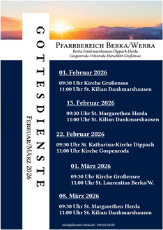 Zu Beginn des neuen Jahres gibt es in unserem Pfarrbereich eine wichtige Neuerung: Ab dem 1. Januar 2026 endet die Zeit der Vakanz für die Gemeinden Herda, Gospenroda, Vitzeroda und Horschlitt. Diese Gemeinden gehören nun gemeinsam mit Berka/Werra, Dankmarshausen, Dippach und Großensee zum Pfarrbereich Berka/Werra. Damit sind wir zu einem großen Pfarramtsbereich zusammengewachsen, der viele Orte, unterschiedliche Prägungen und lebendige Traditionen miteinander verbindet.