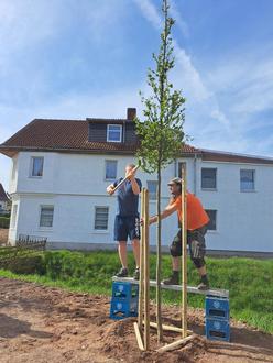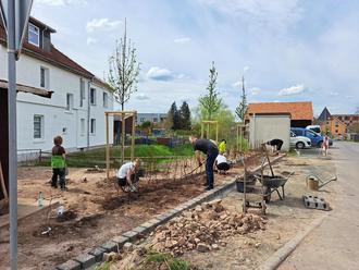 Im Frühjahr 2023 fanden zwei kleine Vorbereitungseinsätze mit großen Materialbewegungen für die am 22. April und 06. Mai durchgeführten großen Arbeitseinsätze und Pflanzaktionen statt. Hierbei wurden mit tatkräftigem Engagement, Musik und guter Laune, zahlreiche Pflanzen um die Linde und Bushaltestelle sowie entlang der Gehwege in die Erde gebracht: