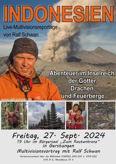 Eine Reise durch Indonesien, vielfältig, geheimnisvoll und spannend. Der Thüringer Ralf Schwan berichtet über emotionale Begegnungen mit Orang Utans im dichten Regenwald Sumatras, von Besteigungen aktiven Vulkanen des „Ring of Fire“ auf Java und Bali (Merapi, Semeru, Bromo, Kawah Ijen und Agung), Tempeln, Göttern, bunten, quirligen exotischen Märkte und spannenden Momenten im Reich der „Drachen“ bei den Komodowaranen. Freuen Sie sich auf ein vielschichtiges und spannendes Porträt, mit eindrucksvollen Fotos und Videos, des Inselarchipels zwischen Asien und Australiens und erleben Sie das Abenteuer des „Ring of Fire“.