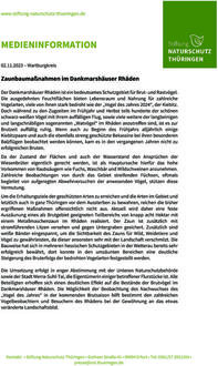 Die Umsetzung erfolgt in enger Abstimmung mit der Unteren Naturschutzbehörde sowie der Stadt Werra-Suhl-Tal, die Eigentümerin einiger betroffener Flurstücke ist. Alle Beteiligten erhoffen sich einen deutlichen Effekt auf die Bestände der Brutvögel im Dankmarshäuser Rhäden. Die Möglichkeit der Beobachtung des Nachwuchses des „Vogel des Jahres“ in der kommenden Brutsaison hilft bestimmt den zahlreichen Vogelbeobachtern und Besuchern des Rhädens bei der Gewöhnung an das etwas veränderte Landschaftsbild.