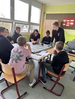 An einer pneumatischen Anlage konnten die Schülerinnen und Schüler im Raum der AE Group arbeiten. Am Nachbartisch wurde es spielerisch. Ein firmeneigenes Vier-Gewinnt-Spiel zog dort die Aufmerksamkeit auf sich. Bevor gespielt wurde, sollten die Mädchen und Jungen die einzelnen Bauteile allerdings erst auseinander- und anschließend nach Zeichnung wieder zusammenbauen.