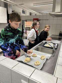 Ein Team vom Bäcker Gerlach erwartete die Gruppen in der Schulküche. Dort wurden leckere Brezeln geformt, mit Salz oder Süßem bestreut und gebacken. Nach einer kurzen Backzeit im Ofen, wurden die Brezeln dann gemeinsam verzehrt.