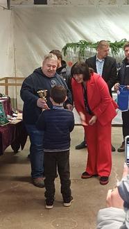 Europaabgeordnete Marion Walsmann übergibt gemeinsam mit Ausstellungsleiter Heiko Schäfer-Bachmann einen Ehrenpreis an den Jungzüchter Dawid Schäfer