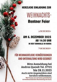 Weiterhin möchten wir auf die Rentnerweihnachtsfeier am 06.12.2025 um 14:30 Uhr in der Turnhalle hinweisen. Vielen Dank an das Organisationsteam um Andrea Quendt!
