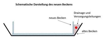 Die Struktur des bestehenden Beckens wird genutzt und das neue Becken darin aufgebaut. Dies hat verschiedene Vorteile. Die alte Bodenplatte muss nicht aufwendig abgebrochen und entsorgt werden und die neue Bodenplatte hat damit einen stabilen Untergrund. Es wurde zwar ein Bodengutachten angefertigt, das Risiko von „Überraschungen“ im Untergrund ist jedoch zu hoch.