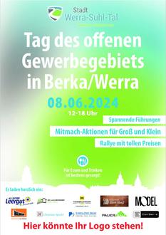 Auf Anregung der Storch-Ciret Logistics GmbH wird es am Samstag, 08.06.2024 von 12 bis 18 Uhr, einen „Tag des offenen Gewerbegebietes“ in Berka/Werra geben. An diesem Tag können sich alle Gewerbetreibenden für Fach- und Ausbildungskräfte präsentieren. Geboten wird ein buntes Programm und viele Aktionen zum Mitmachen. Eine umfassende Programmvorschau folgt.
