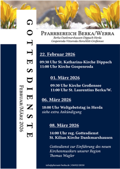| Gemeindebüro Di-Fr 9-14 Uhr Anja Böttner 036922/409325 sekretariat@pfarramt-berka.de |