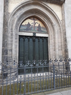 An dieser Tür hat Martin Luther der Überlieferung nach am 31. Oktober 1517 auf einem Plakat 95 Thesen in lateinischer Sprache bekannt gegeben, um darüber mit Gelehrten zu disputieren. Die Disputation sollte Klarheit darüber bringen, ob der Handel der Kirche mit „Ablassbriefen“ dem entspreche, was Jesus einmal gewollt hat. Das war der Anfang der Reformation.