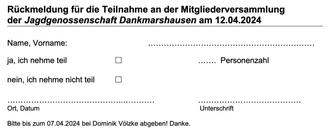 Zur Versammlung werden nur Jagdgenossen zugelassen, die ihren satzungsgemäßen Pflichten nachgekommen sind und den Nachweis des Eigentums an bejagbarer Fläche im GJB erbracht haben!