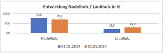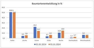 Mit dem Beginn des Jahres 2018 sorgten 2 Extremwetterereignisse (Sturm Friederike und Irenäus) für starke Windwurfschäden. Die extremen klimatischen Veränderungen und Hitzejahre im Anschluss machten eine normale forstliche Bewirtschaftung unmöglich. Es wurden seitdem fast ausschließlich Kalamitätsnutzung bedingt durch Borkenkäferbefall in der Fichte getätigt und entstanden Schadflächen wiederbewaldet. Somit kam es zu einer Verschiebung in der Baumartenzusammensetzung. Die Fichte ist der Verlierer der klimatischen Veränderungen und wird auch im kommenden Jahrzehnt weitere Verluste erleiden müssen. Ihren Platz wird überwiegend Laubholz einnehmen. Dies geschieht zum Teil über Naturverjüngung oder künstliche Wiederbewaldung. Im letzten Jahrzehnt gab es bereits eine Zunahme von ganzen 7 %! Die Kiefer ist und bleibt Hauptbaumart im Kommunalwald.