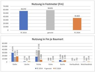 Laut Forsteinrichtung sollten im letzten Jahrzehnt 56.372 Festmeter (Fm) genutzt werden, tatsächlich wurden aufgrund der Kalamitäten 58.631 Fm genutzt. Die Mehrnutzungen in der Fichte sorgten dafür, dass Flächen anderer Baumarten nicht im vorgegebenen Maß durchforstet und gepflegt werden konnten.