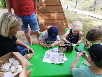 Pünktlich 15.00 Uhr eröffnete der Kindergarten, mit einem kleinen Programm der Kinder, ihr Sommerfest. Während die Gäste gemütlich bei Kaffee und leckerem Kuchen, aus der Kaffeestube verweilten, konnten sich die Kinder auf der Aktionsfläche austoben. Es gab verschiedene Stationen, u.a. Eierlauf, Torwand schießen, Schubkarrenlauf, Dosen werfen, Ringwurf, Glitzer Tattoos, Steine und Eimer bemalen. Für jedes Kind war etwas dabei.