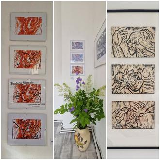 Eine Originaldruckplatte konnte ich auch genauer in Augenschein nehmen. Die feinen Vertiefungen und Schnitzereien, so könnte man es nennen, waren schon faszinierend. Der Künstler selbst unterhielt uns, zusammen mit seiner Frau, auf sehr gekonnte musikalische Weise und erzählte uns auch viel Interessantes zu einigen Drucken und ihrer Entstehungsgeschichte. Für einen Farbdruck müssen mehrere verschiede Druckplatten geschnitzt werden, da für jede Farbe eine neue Platte benötigt wird. Das ist schon eine aufwendige Arbeit, aber die Werke sprechen umso mehr für sich.