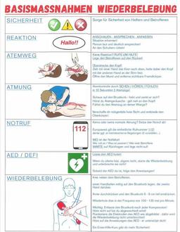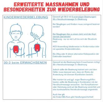 Wichtig! Ein AED kommt immer erst dann bei der Wiederbelebung zum Einsatz, wenn sich mindestens zwei (Laien) Ersthelfer bei der bewusstlosen Person befinden. Nur so kann gewährleistet werden, dass nach Absetzen des Notrufs ein Ersthelfer sofort mit der Herz-Druck-Massage und Mund-zu-Mund Beatmung beginnt, während der zweite den AED ausfindig macht. Es ist wichtig, so schnell wie möglich mit der Wiederbelebung zu starten, diese konstant durchzuführen und nicht durch Suchen des Defibrillators zu unterbrechen.