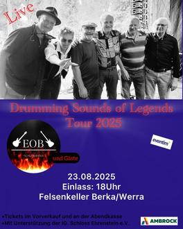 Jubiläumskonzert der Thüringer Kultband E.O.B. aus Ohrdruf im Felsenkeller Berka/Werra. Gemeinsam mit Profi- Musikern aus ganz Deutschland wird das Konzert am 23.08.2025 um 19Uhr stattfinden. Selbstgeschriebene Hits und bekannte Songs sind Teil dieses einmaligen Konzertabends, bei dem mitmachen und feiern garantiert ist. Mit dabei, Schülerinnen und Schüler der Eichelbergschule Berka (Schulchor) und die originale Besetzung der Ohrdrufer Rockband E.O.B.
