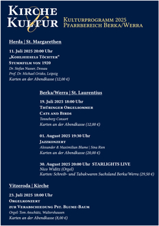 Ob Konzerte, Lesungen, Theaterprojekte oder interaktive Formate - "Kirche und Kultur" will Räume schaffen, in denen Spiritualität und Glaube erfahrbar wird - im freien Spiel der Künste und im offenen Gespräch über das, was uns im Innersten bewegt.