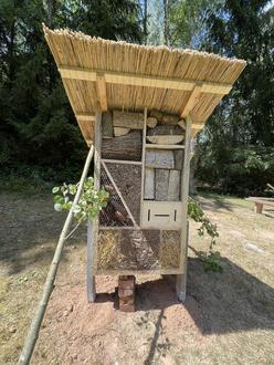 Achtsam durch die Flur zu gehen, zu hören und zu staunen reicht nicht aus. Deshalb gab es am nächsten Tag ein Angebot, um die Tiere in ihrem Lebensraum zu unterstützen. Dank dem Engagement einiger tatkräftiger Herren und der Hilfe unserer Kinder wurde ein großes Insektenhotel gefüllt und unter fröhlichem Gesang aufgestellt.