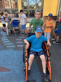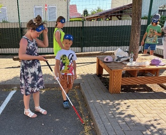 Bei dem Behindertenparcours mit Rollator und Rollstuhl, dem Laufen mit den Gehilfen oder dem Blindenstock bei verdeckten Augen, sowie ertasten von Materialien in Fühlboxen konnten die Kinder die Probleme bei Behinderungen erkennen und wurden für die Problematik sensibilisiert, denn in unserer Gesellschaft wird noch viel zu wenig für die Inklusion von gesundheitlich eingeschränkten Menschen getan.