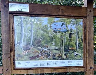 Am Eingang zum Wolfter, hinter dem Zweirad-Center Herbach, lesen wir: „Was gibt es im Wald zu entdecken?“