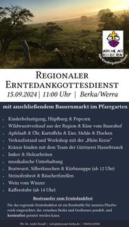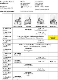 In der St. Laurentius-Kirche in Berka finden die Gottesdienste derzeit nicht turnusmäßig statt. Wir haben uns als Gemeindekirchenrat dazu entschieden, die Gottesdienste in Berka zu reduzieren und unsere gottesdienstlichen Feiern auf kirchenjahreszeitliche Hochfeste und Gottesdienste im Zusammenhang mit Gemeindefesten zu konzentrieren. Außerdem intensivieren wir unser kirchenmusikalisches und kulturelles Angebot!
