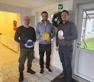 Übergabe von links: Hauptamtsleiter Herr Möller, Leitung Kindergarten Brattendorf Herr Bretschneider, Fa. Stryker Herr von Wachsmann
