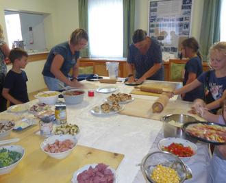Der Backhausschlot rauchte am 20. September schon beizeiten, denn die Kinder wollten Pizza backen. Alle, die Appetit auf Pizza hatten, trafen sich für die Vorbereitungsarbeiten im Dorfgemeinschaftshaus Poppenwind. Es war eine Freude zuzusehen, wie das Schnippeln von Gemüse und Obst, Wurst und Schinken den Kindern von der Hand ging. Und beim Kneten und Ausrollen des Teiges war Muskelkraft gefragt. Das Belegen der Pizzen war dann ein Leichtes. Lauch, Tomaten, Paprika, Gurke, Birne, Wiener, Salami … und/oder … wurden nach Geschmack von den Kindern auf die ausgerollten Teigplatten verteilt.